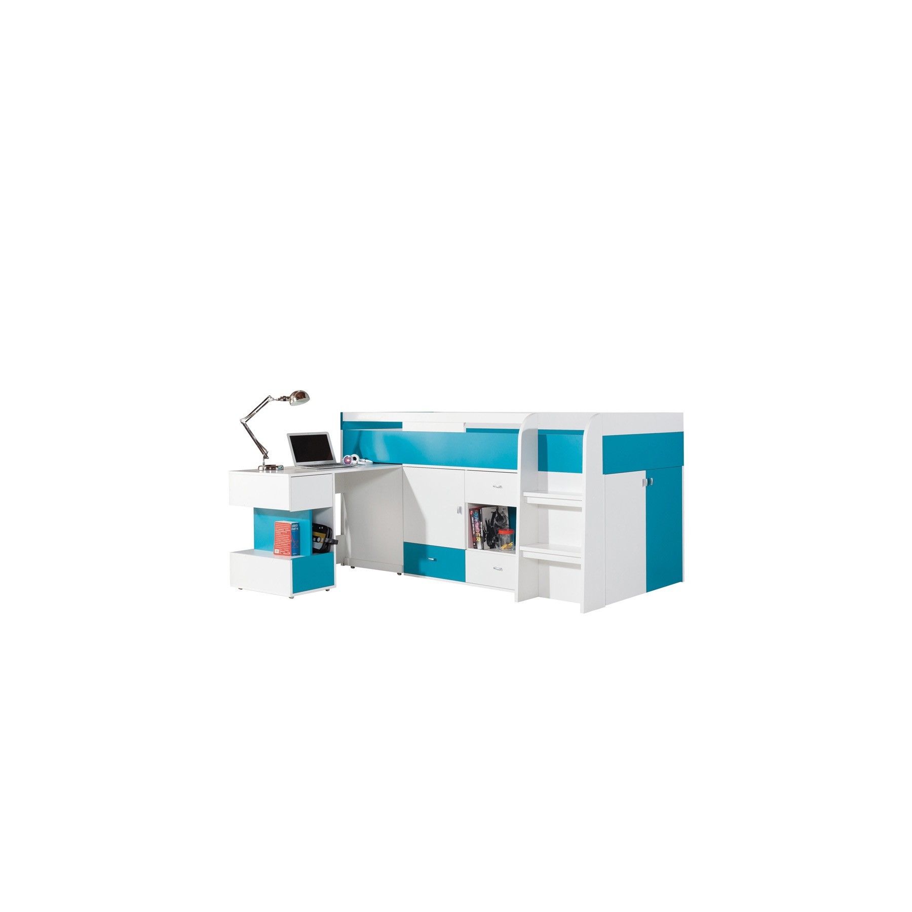 Łóżko wyposażone jest w biurko oraz dużą ilość szafek, co zapewnia funkcjonalność mebla.