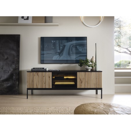 Szafka RTV z kolekcji SENTO to mebel w loftowym, minimalistycznym stylu. Wykonanie w kolorze dąb wotan ożywi oraz nada przytulności każdemu salonowi. Okazałe metalowe nogi to element, który nie tylko nadaje designu ale również ułatwia codzienne porządki.